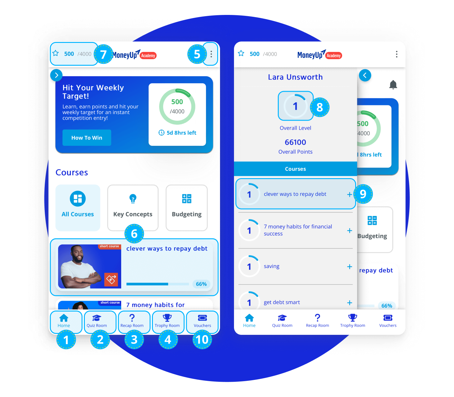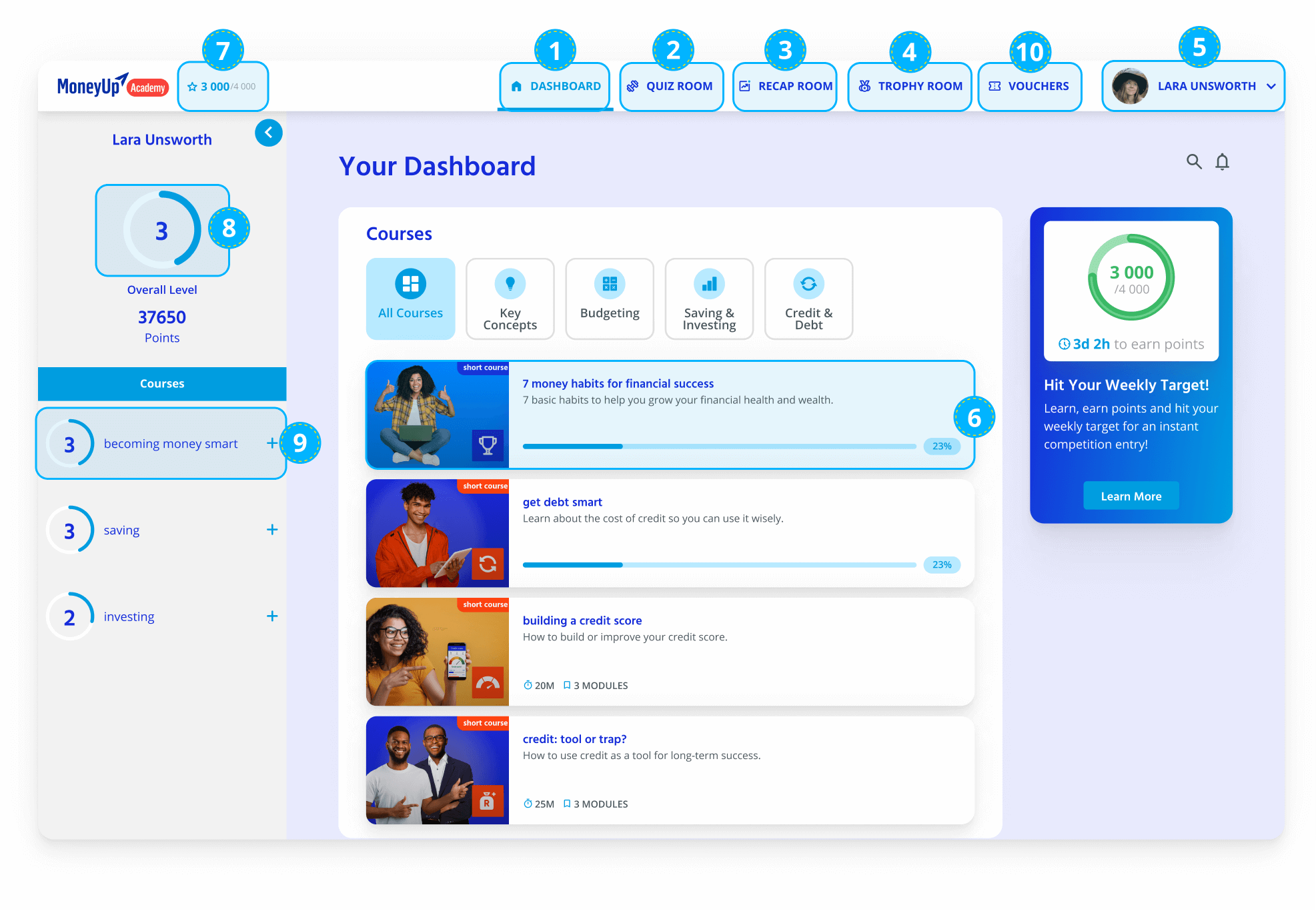 - Dashboard – This tab will take you back to the dashboard (home) screen. This screen displays all the available courses and how far you’ve progressed on them. It also displays quick links to the, Recap Room, Quiz Room, Trophy Room and Vouchers tab. to the Competition rules, where you can view full details on how to win weekly and monthly voucher prizes.